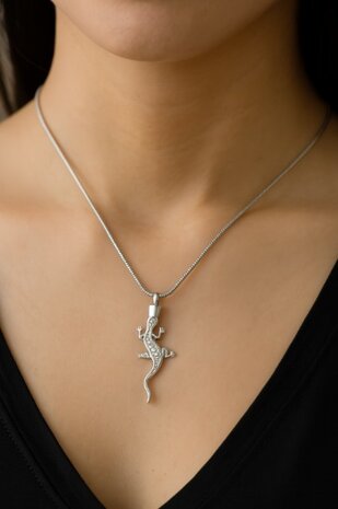 Wilt u bij dit prachtige assieraad in de vorm van een hagedis een bijpassende zilverkleurige ketting bestellen? Dan kunt u deze aanvinken bij de bestelopties.