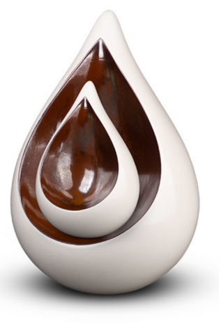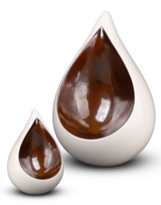 Deze druppelvormige urn in het wit met bruinrood kan zowel binnen als buiten neergezet worden. De urn heeft een mooie strakke vormgeving en past perfect in elk type interieur. Dit soort urnen in de vorm van een druppel worden vaak gezien als traan. Ze staan symbool voor verdriet en gemis nadat iemand is overleden. Het verdriet en gemis zal nooit geheel verdwijnen. Maar het is fijn als een geliefd persoon een mooi plekje krijgt. Fijn thuis, dichtbij in de tuin of op een gedenkplaats in de buurt. Zo is er altijd een tastbare herinnering.
