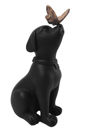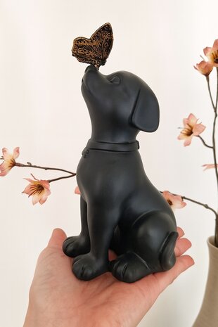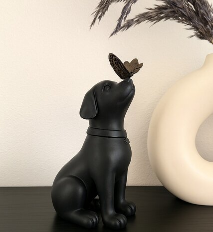 De urn hond met vlinder op de neus is mat zwart afgewerkt. Het hondenbeeldje is gemaakt van polyresin en heeft de uitstraling van een verbronsde hond. Het hondenbeeldje kan ook buiten geplaatst worden.